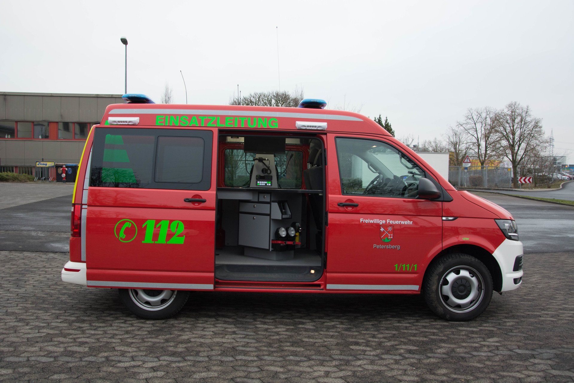 Diese Bezeichnung erklärt schon sehr viel über den Verwendungszweck dieses Fahrzeuges. Es verfügt über vier Sitzplätze und bietet dabei zwei vollwertige Funkarbeitsplätze. Neben Digitalfunk ist der ELW mit einer Telefonanlage, WLAN, Fax, sowie einem PC und Drucker ausgestattet. Für den sicheren Einsatz verfügt das Fahrzeug zusätzlich über eine LED-Umfeldbeleuchtung sowie eine Heckwarneinrichtung. Der autarke Betrieb kann mittels des verlasteten Stromerzeugers sichergestellt werden. Zusätzlich stehen in diesem Fahrzeug Kartenmaterial, Einsatzpläne und Gefahrgut-Nachschlagewerke zur Verfügung. Somit ist dieses Fahrzeug ein wichtiger Baustein für die Führungsunterstützung der Einsatzleitung vor Ort, gerade bei größeren Einsatzlagen.